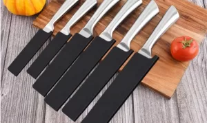 I like to store my knives away from other utensils and put plastic covers or sheaths on them to protect the edge and our hands.