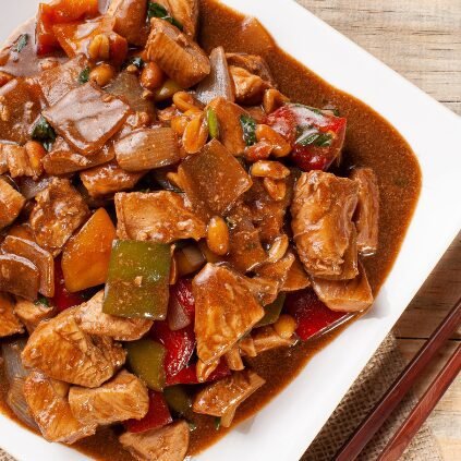 This dish, a beloved classic in Brazilian-Chinese cuisine, features tender chicken pieces stir-fried with crunchy bell peppers, savory onions, and a rich, flavorful sauce that’s both spicy and sweet.